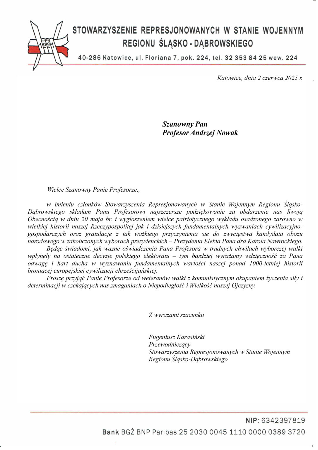 w imieniu członków Stowarzyszenia Represjonowanych w Stanie Wojennym Regionu Śląsko-Dąbrowskiego składam Panu Profesorowi najszczersze podziękowanie za obdarzenie nas Swoją Obecnością w dniu 20 maja br.i wygłoszeniem wielce patriotycznego wykładu osadzonego zarówno w wielkiej historii naszej Rzeczypospolitej jak i dzisiejszych fundamentalnych wyzwaniach cywilizacyjno-gospodarczych oraz gratulacje z tak ważkiego przyczynienia się do zwycięstwa kandydata obozu narodowego w zakończonych wyborach prezydenckich – Prezydenta Elekta Pana dra Karola Nawrockiego.