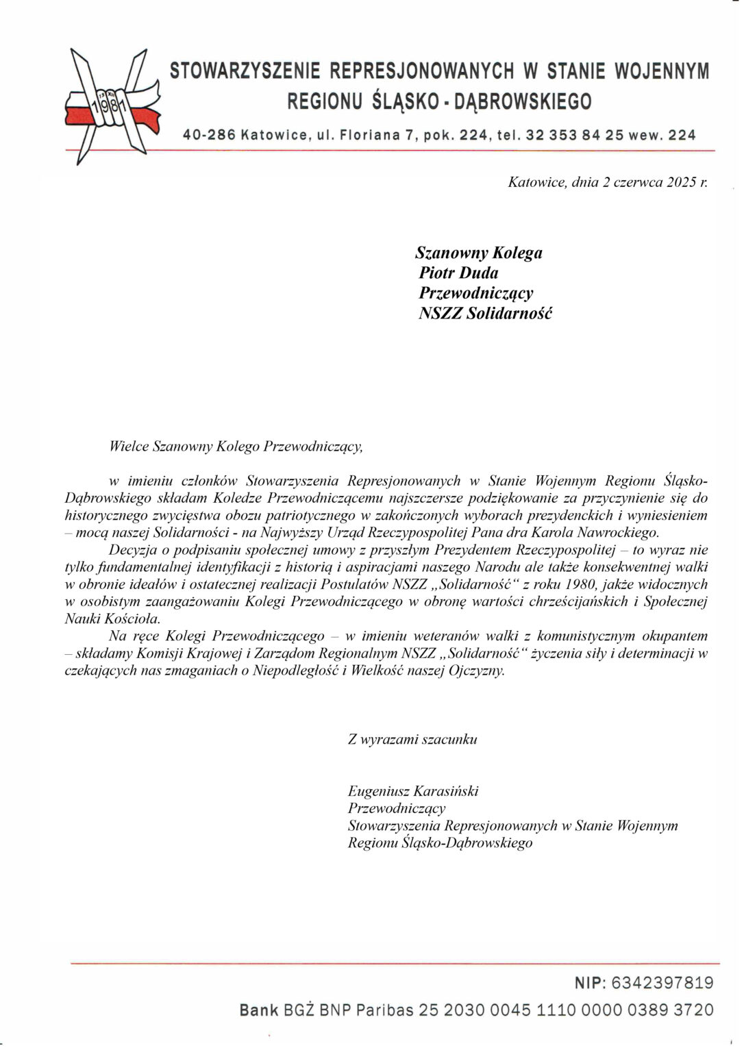 w imieniu członków Stowarzyszenia Represjonowanych w Stanie Wojennym Regionu Śląsko-Dąbrowskiego składam Koledze Przewodniczącemu najszczersze podziękowanie za przyczynienie się do historycznego zwycięstwa obozu patriotycznego w zakończonych wyborach prezydenckich i wyniesieniem – mocą naszej Solidarności – na Najwyższy Urząd Rzeczypospolitej Pana dra Karola Nawrockiego.